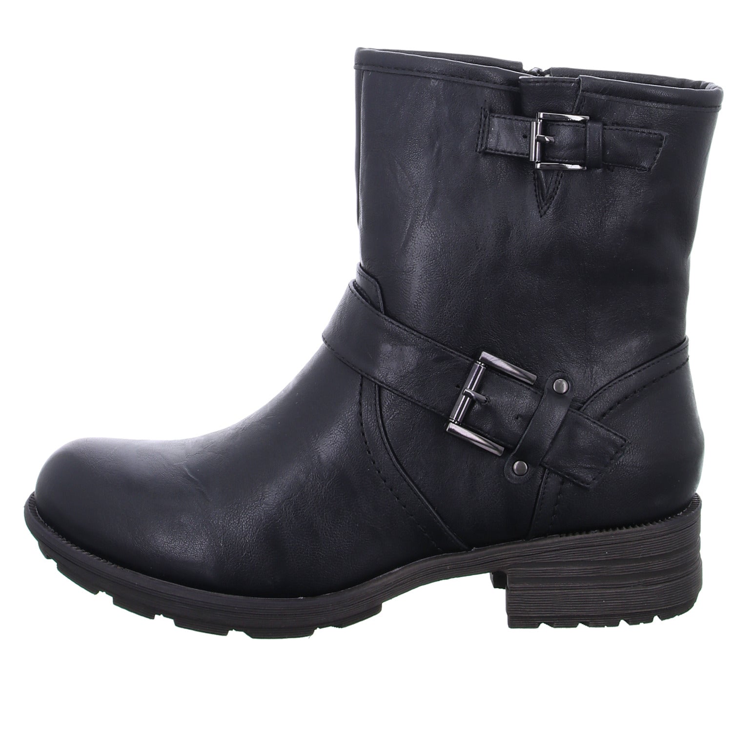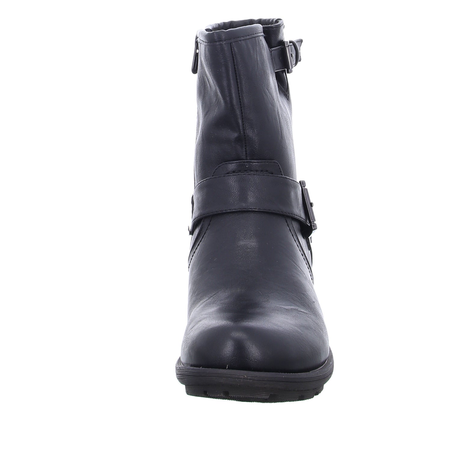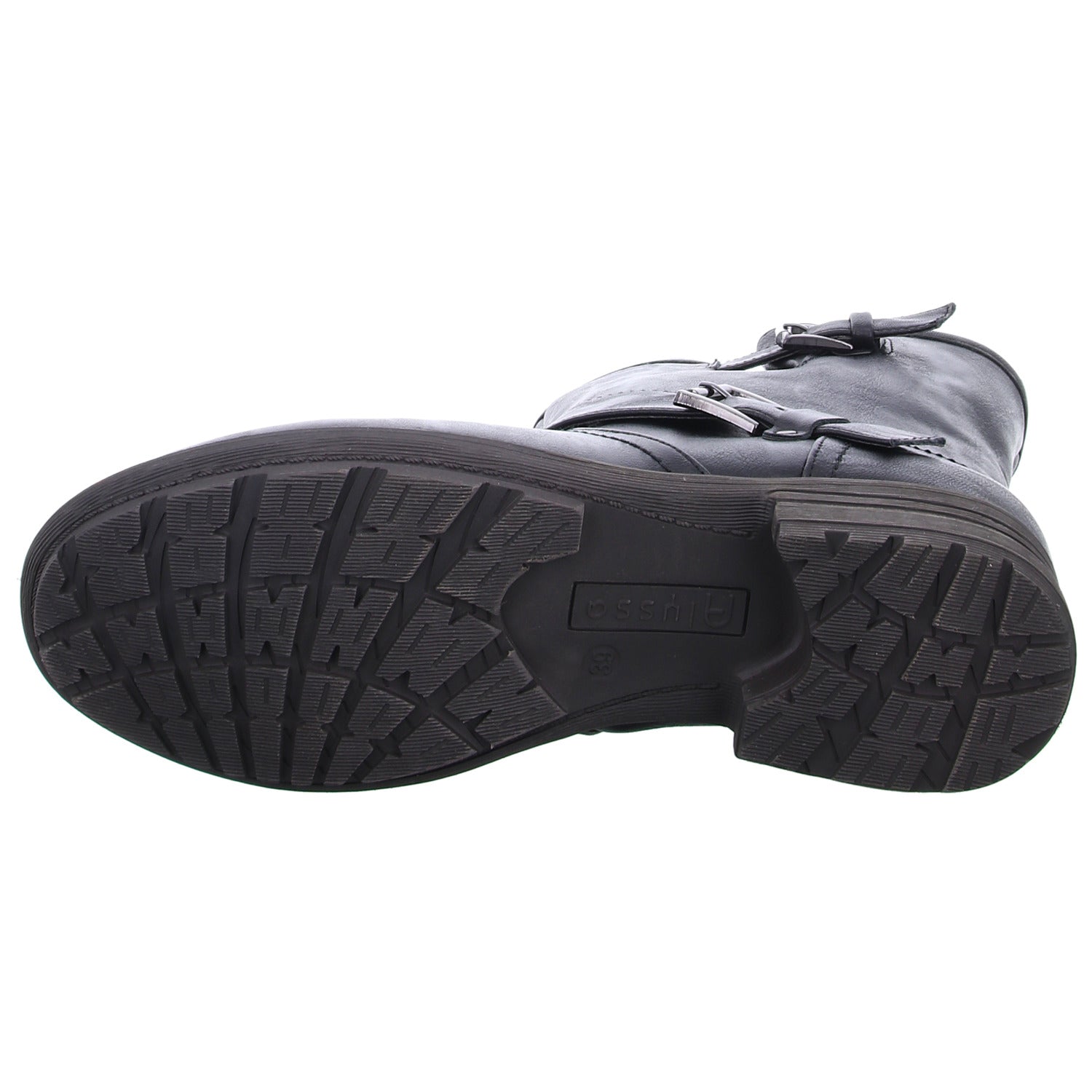 Die um den Schaft geführten Riemen sind mit auffälligen Schnallen besetzt.