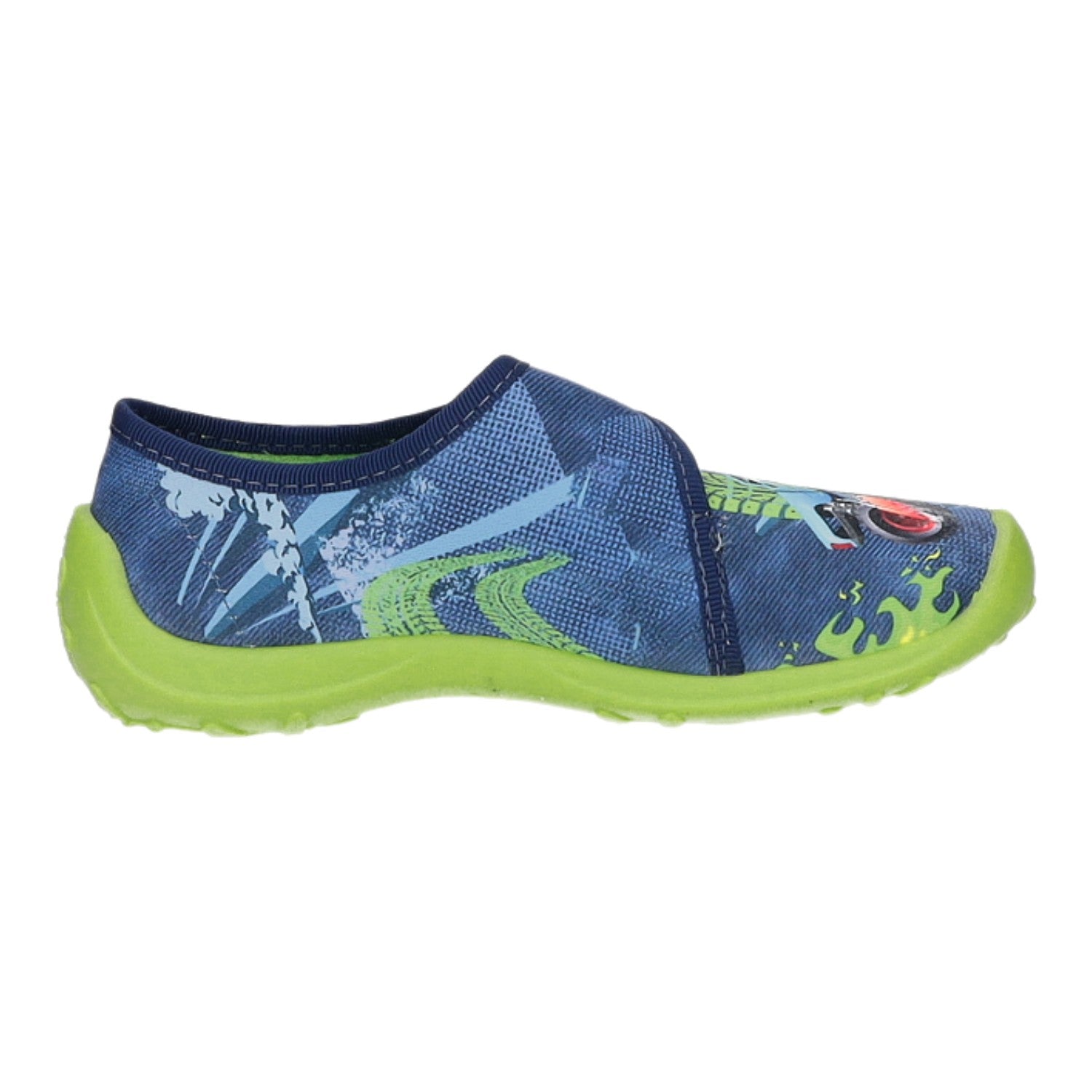 Das Obermaterial besteht aus weichem blau/mehrfarbigem Textil.
