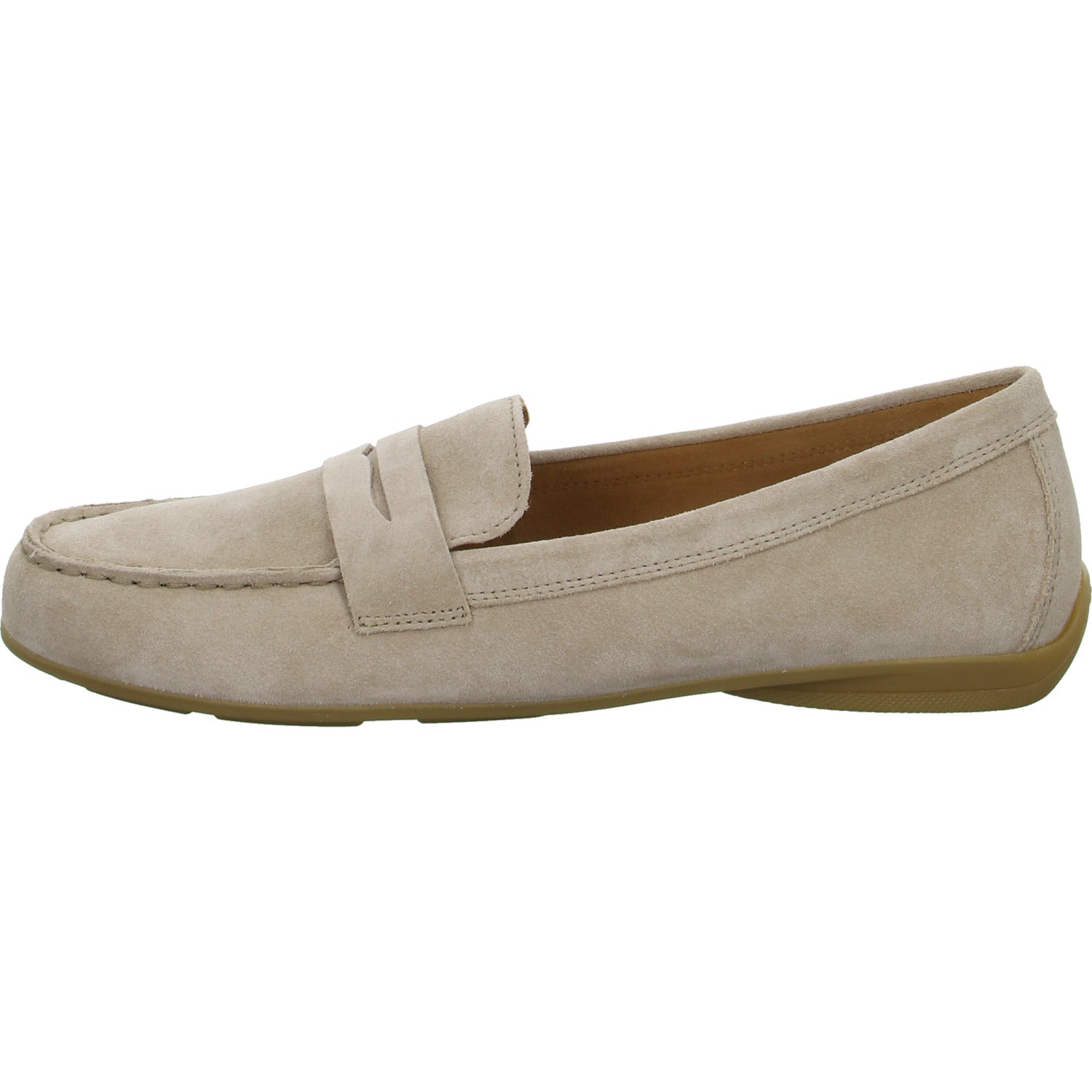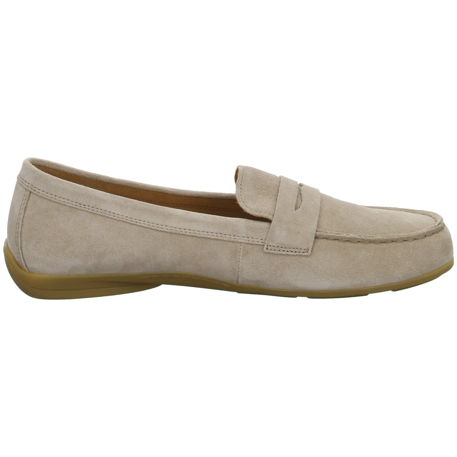 Das Obermaterial besteht aus hochwertigem mittel beigem Veloursleder.