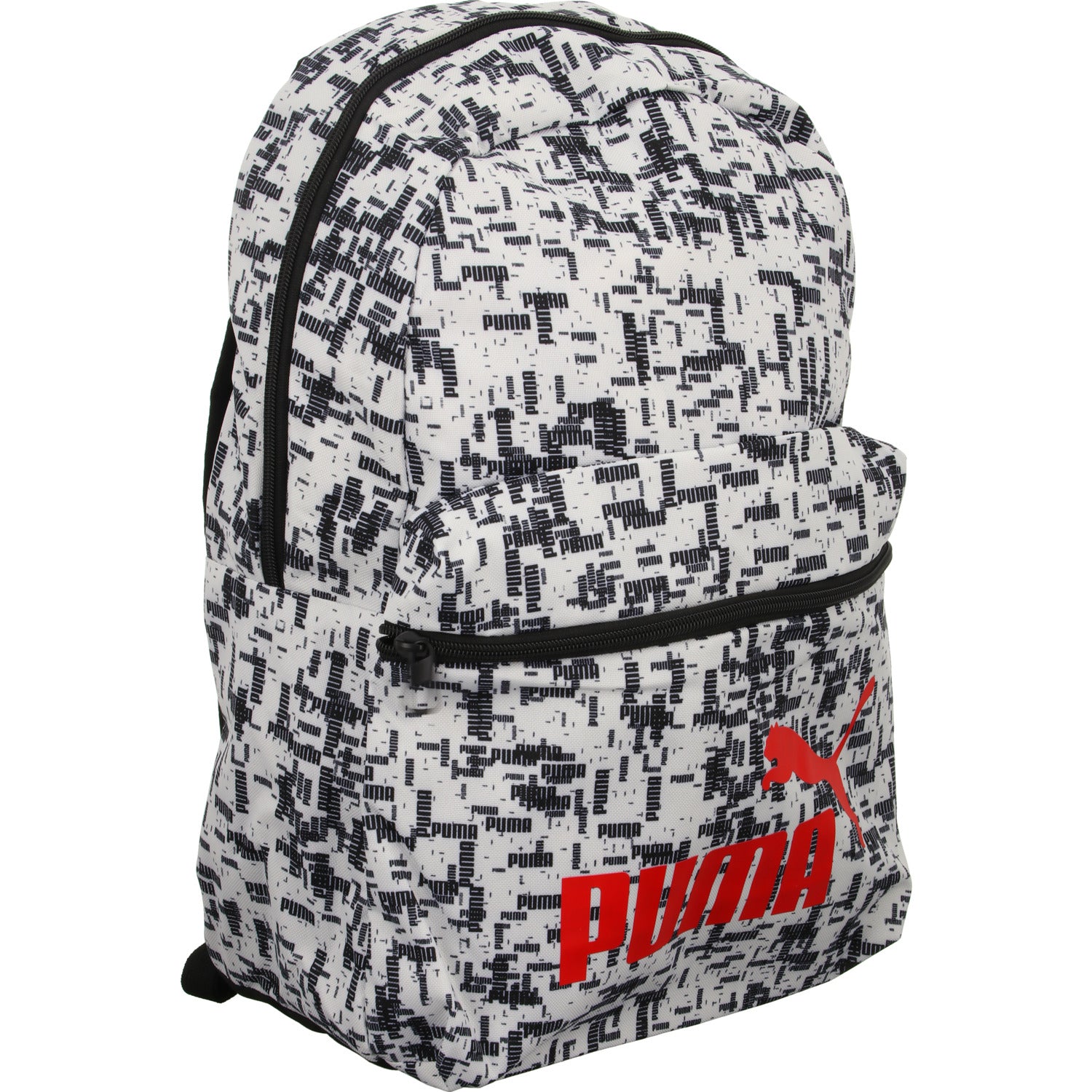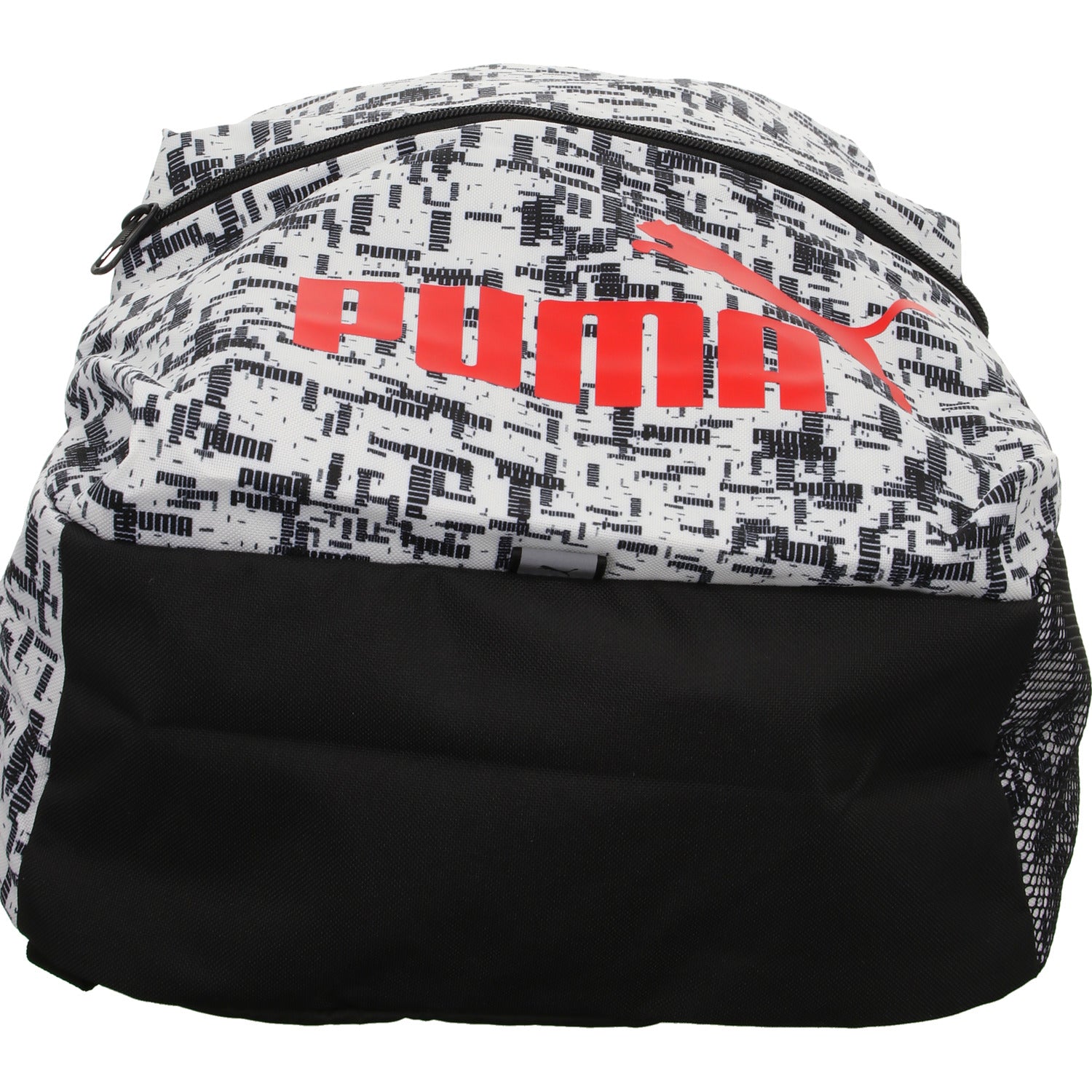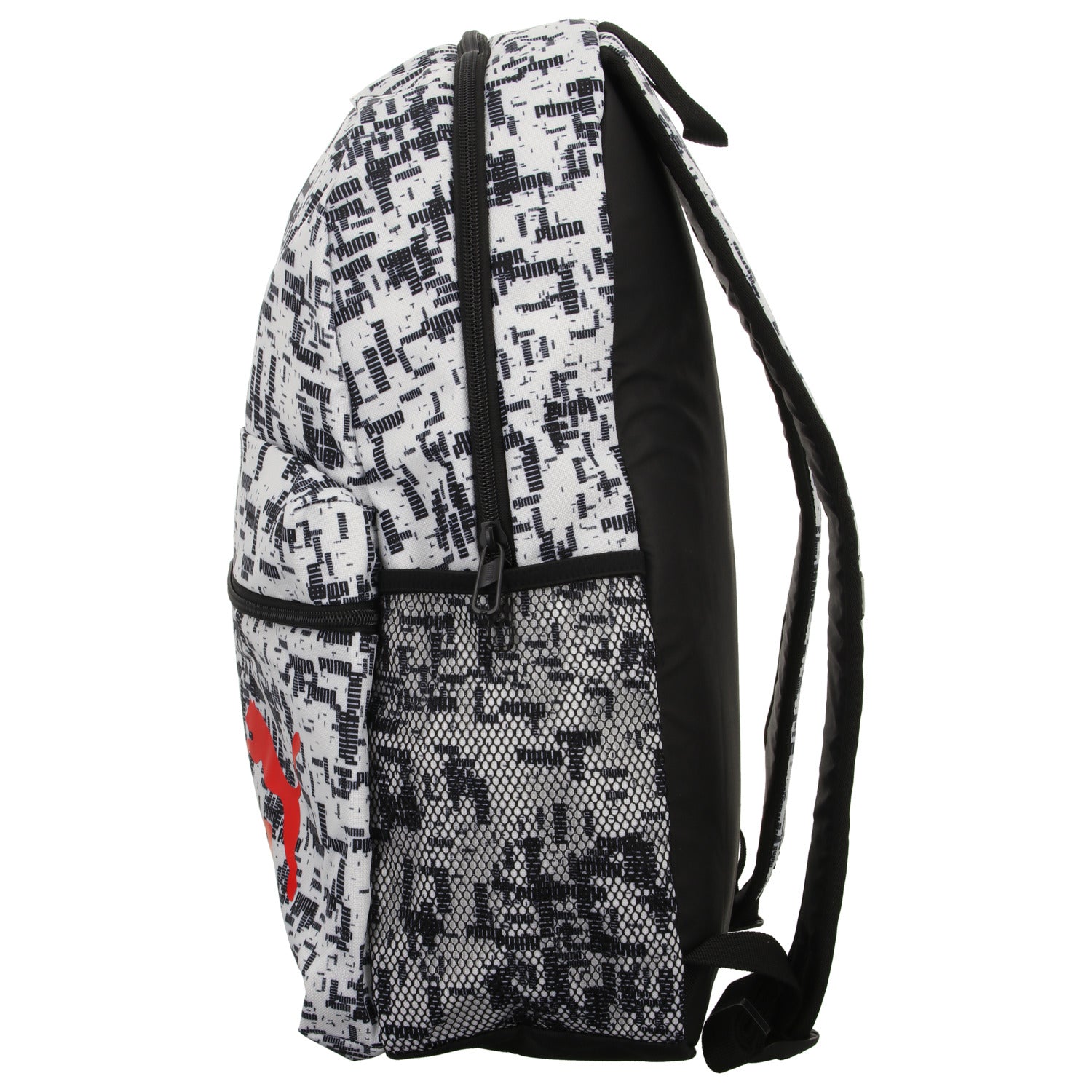 Gefertigt aus weiß/schwarzem Textil mit rotem Logo.