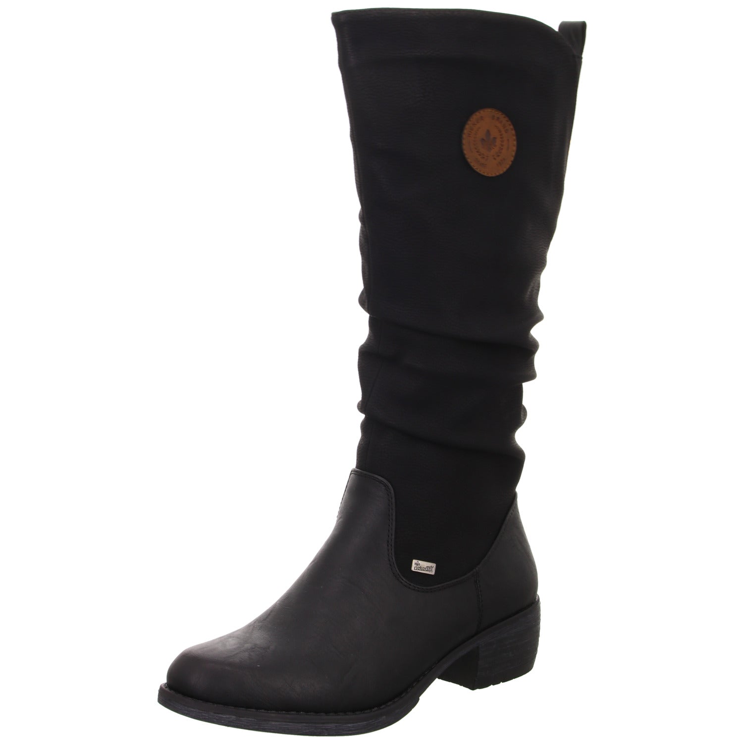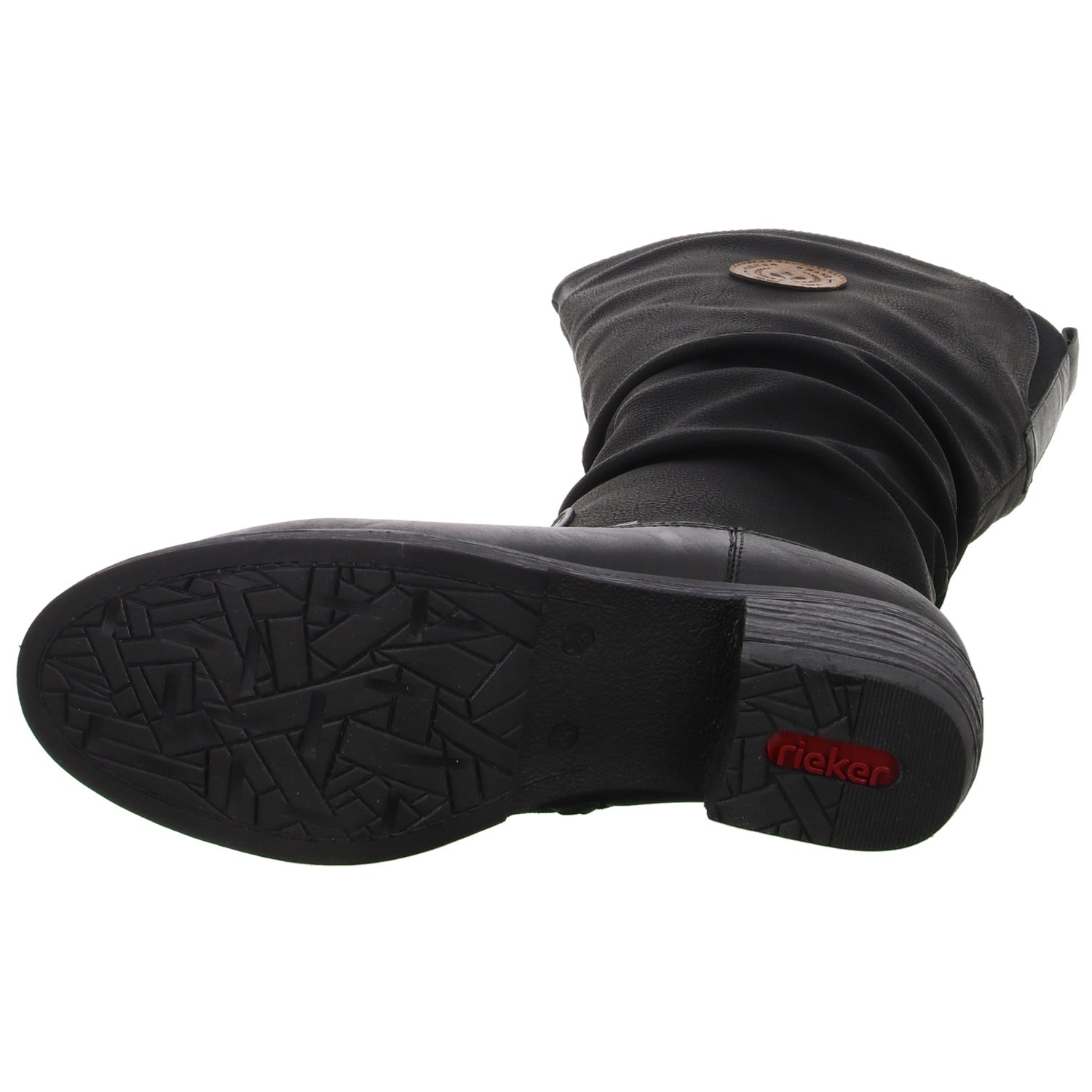 Gefertigt aus weichem schwarzem glattem Kunstleder und kleinem braunem Rieker Logo.