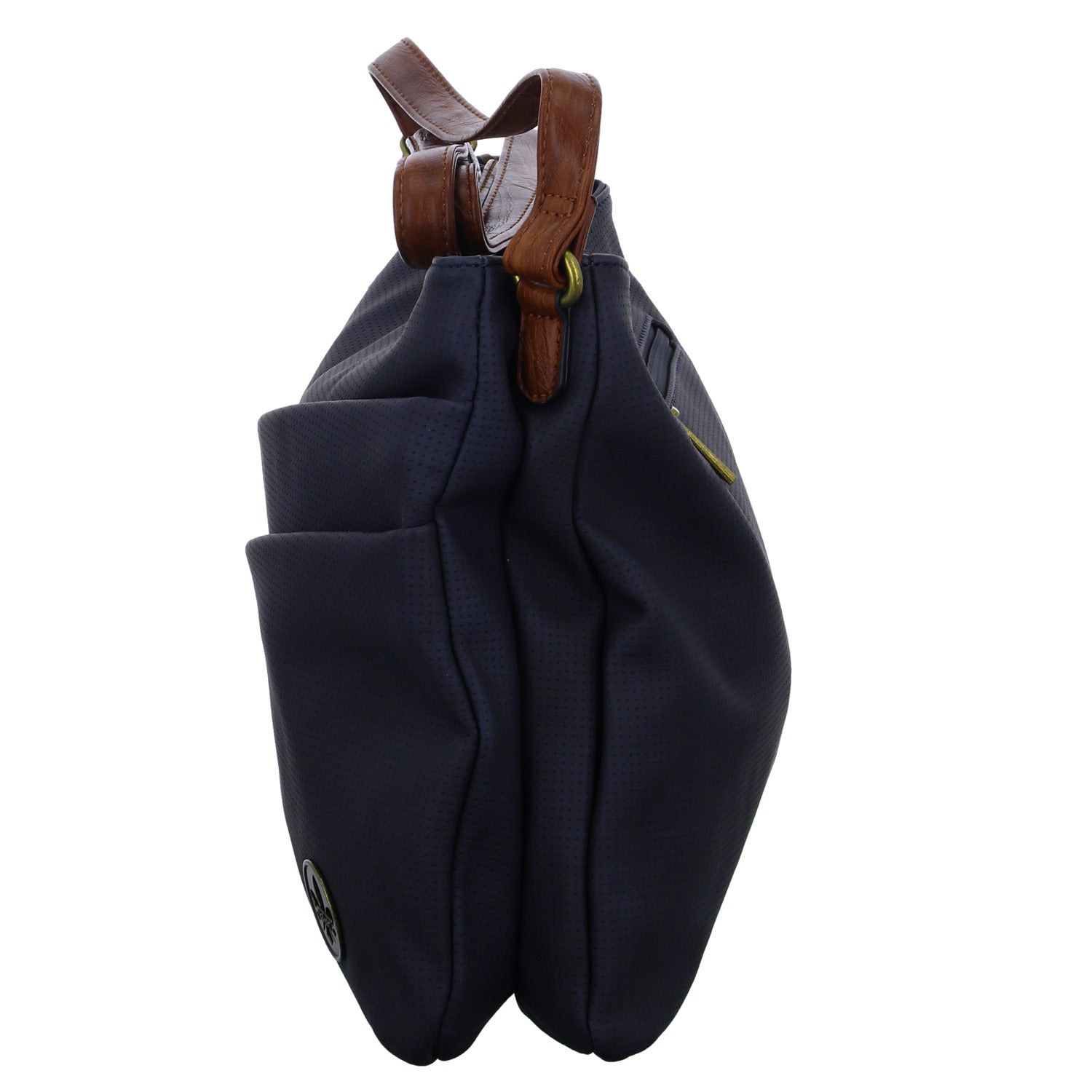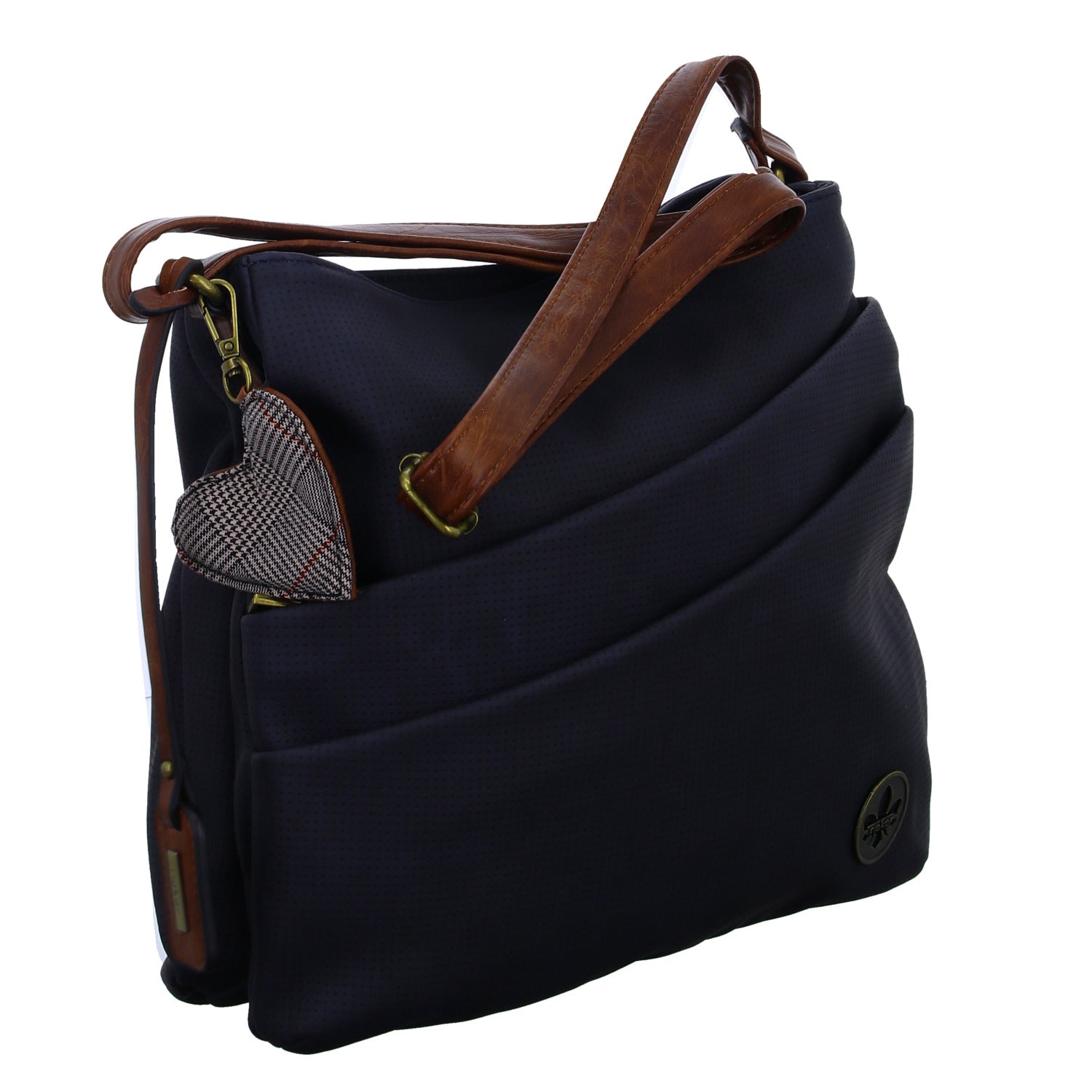 - Vorne: ein schräg zulaufendes Reißverschlussfach, ein Schubfach mit Druckknopf