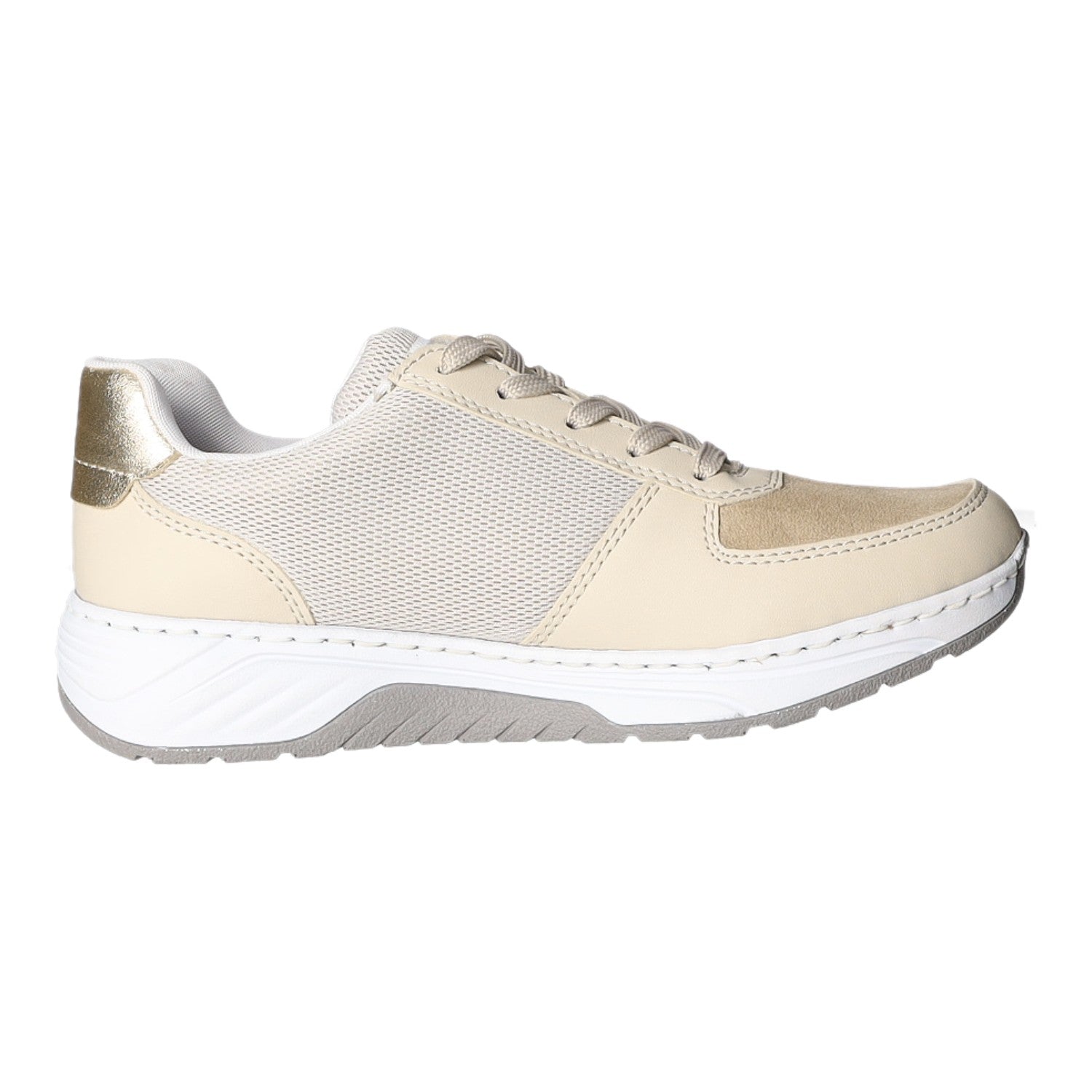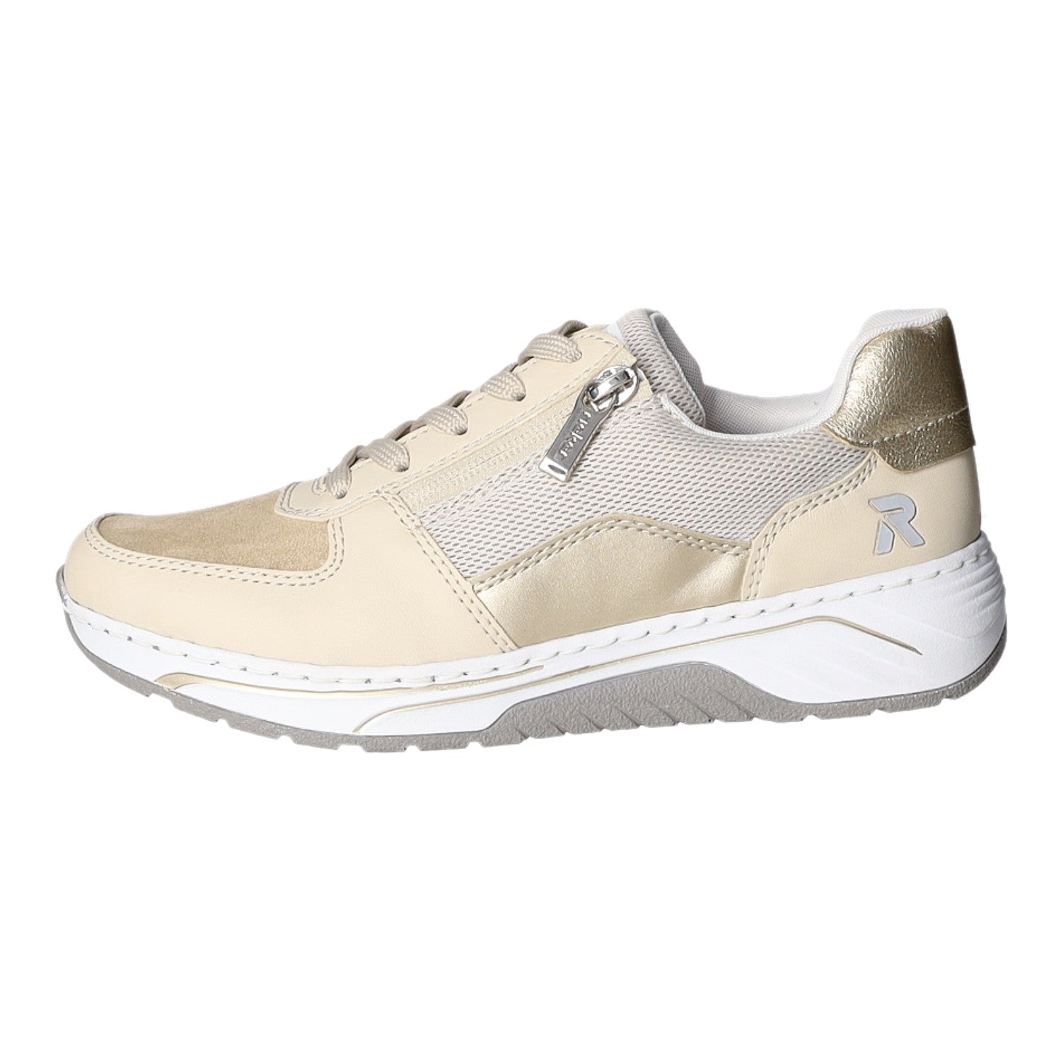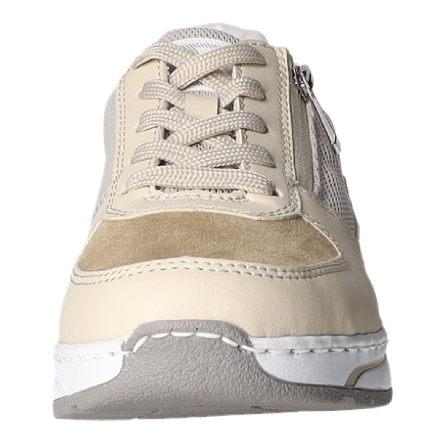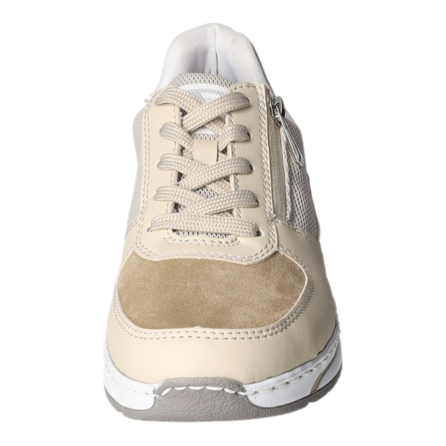 Die Kombination aus Reißverschluss und Schnürung gibt einen optimalen Halt. Das beige Obermaterial aus Kunstleder ist pflegeleicht.
