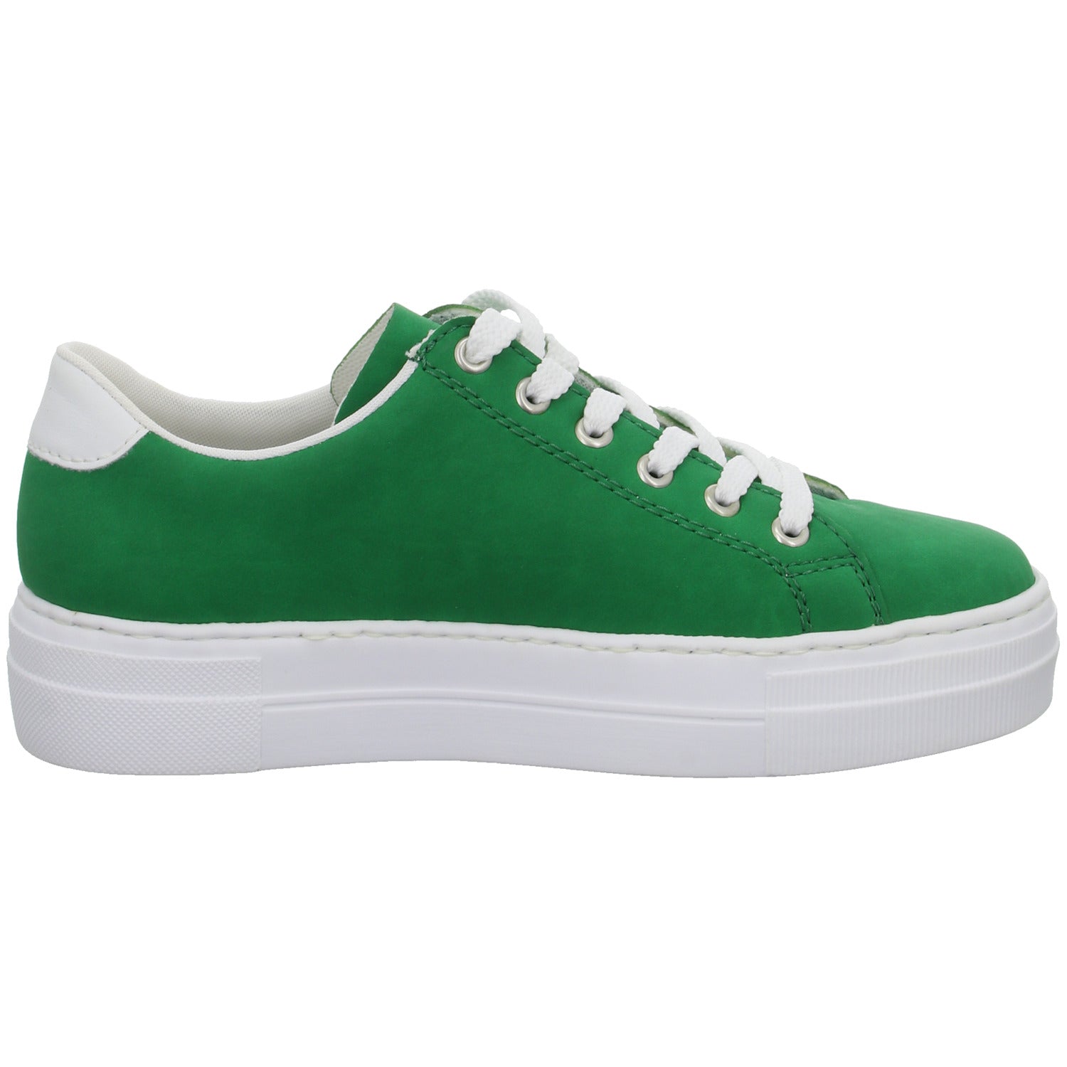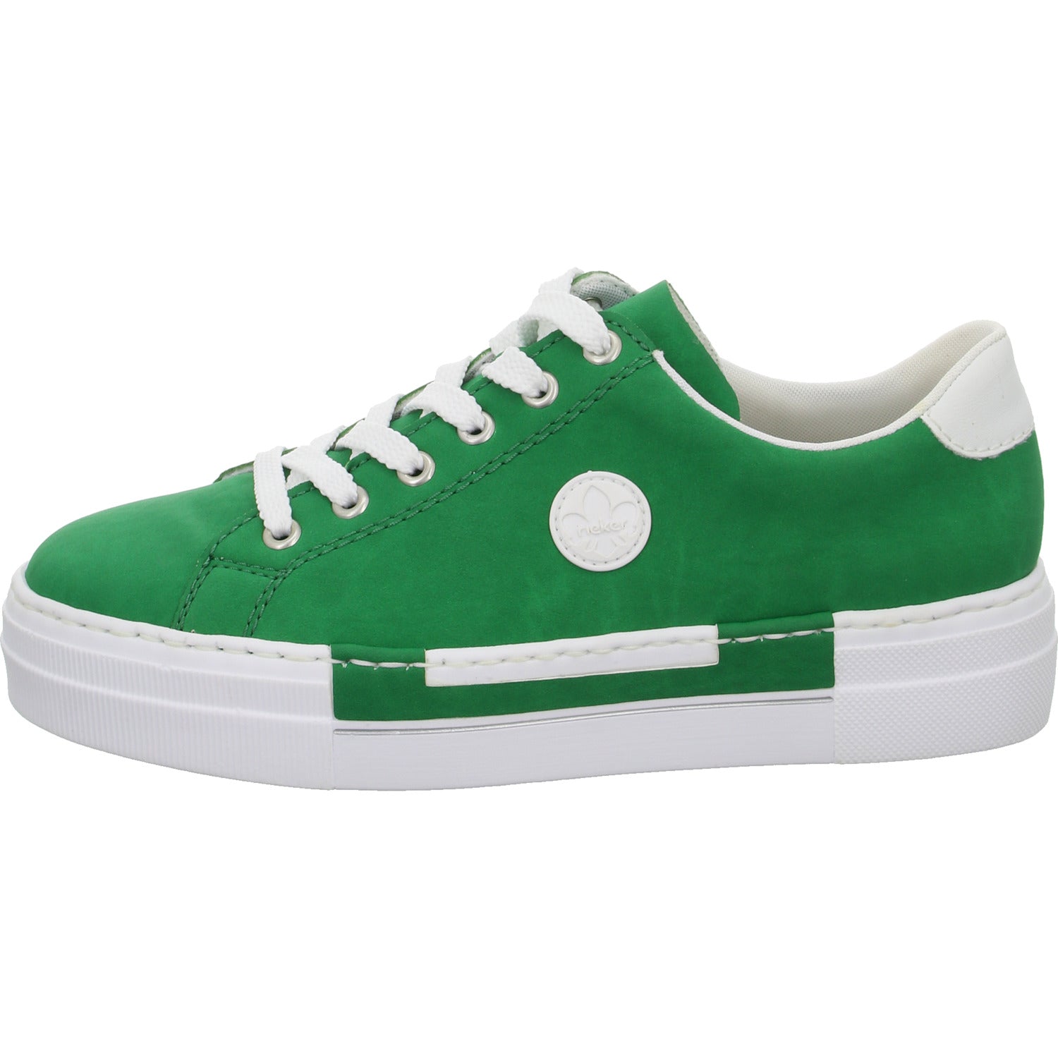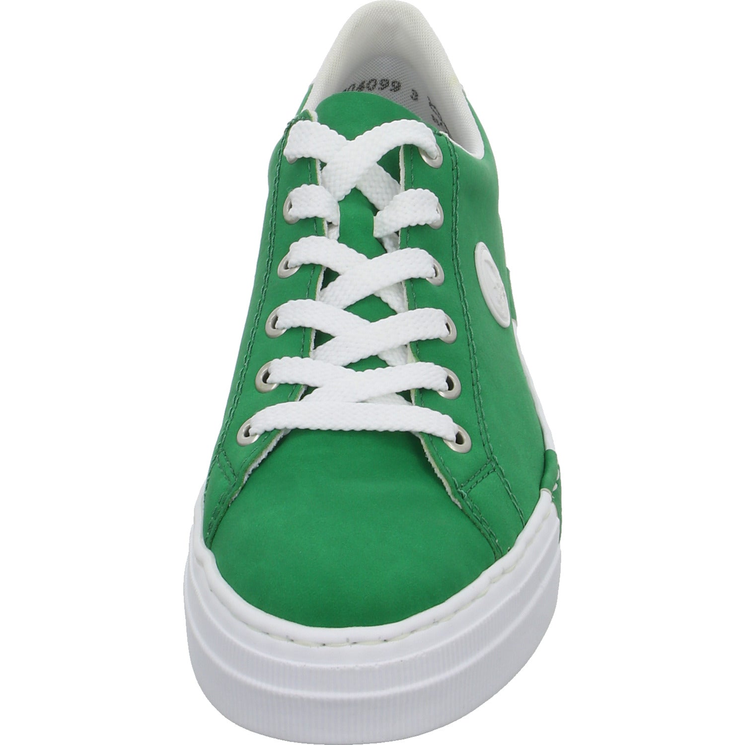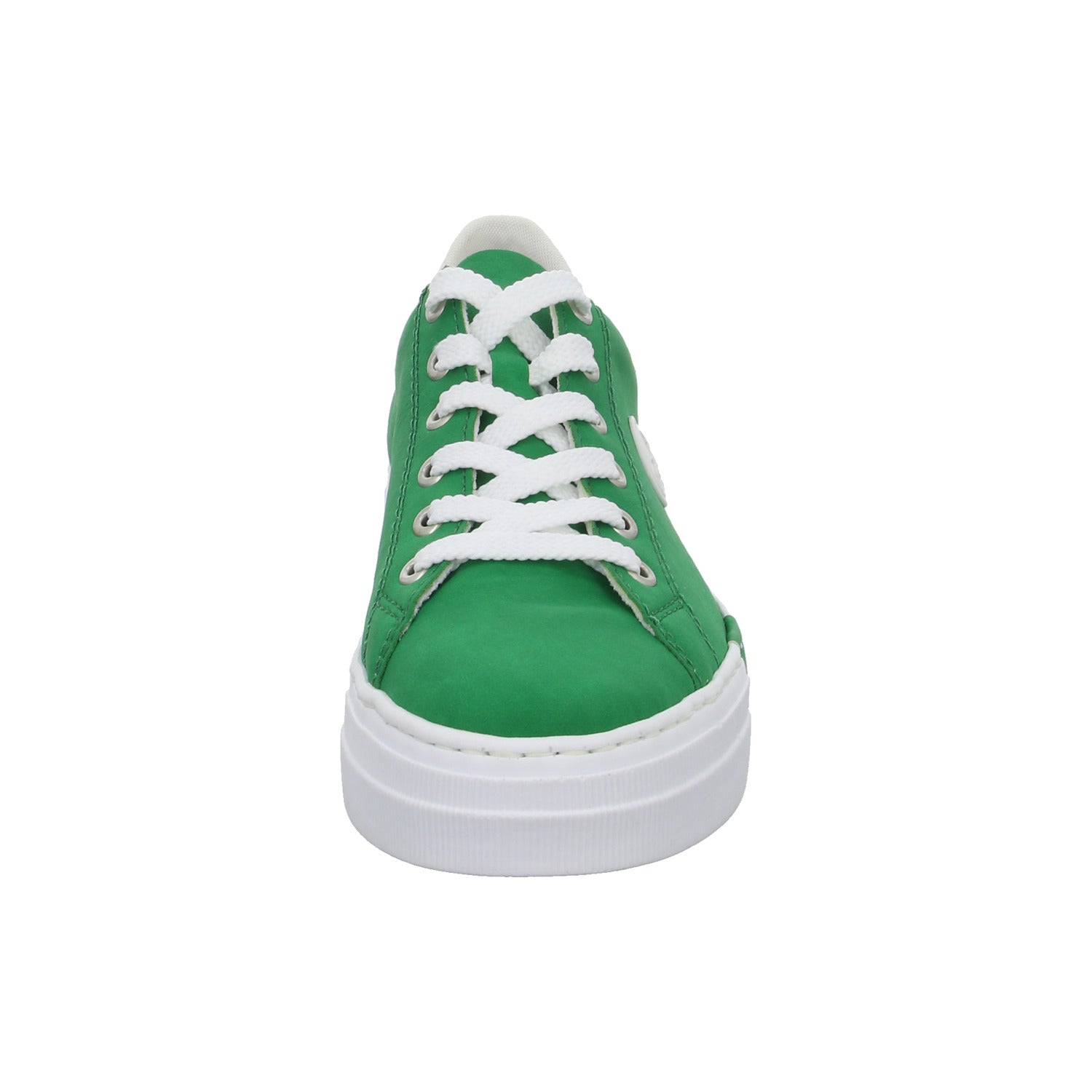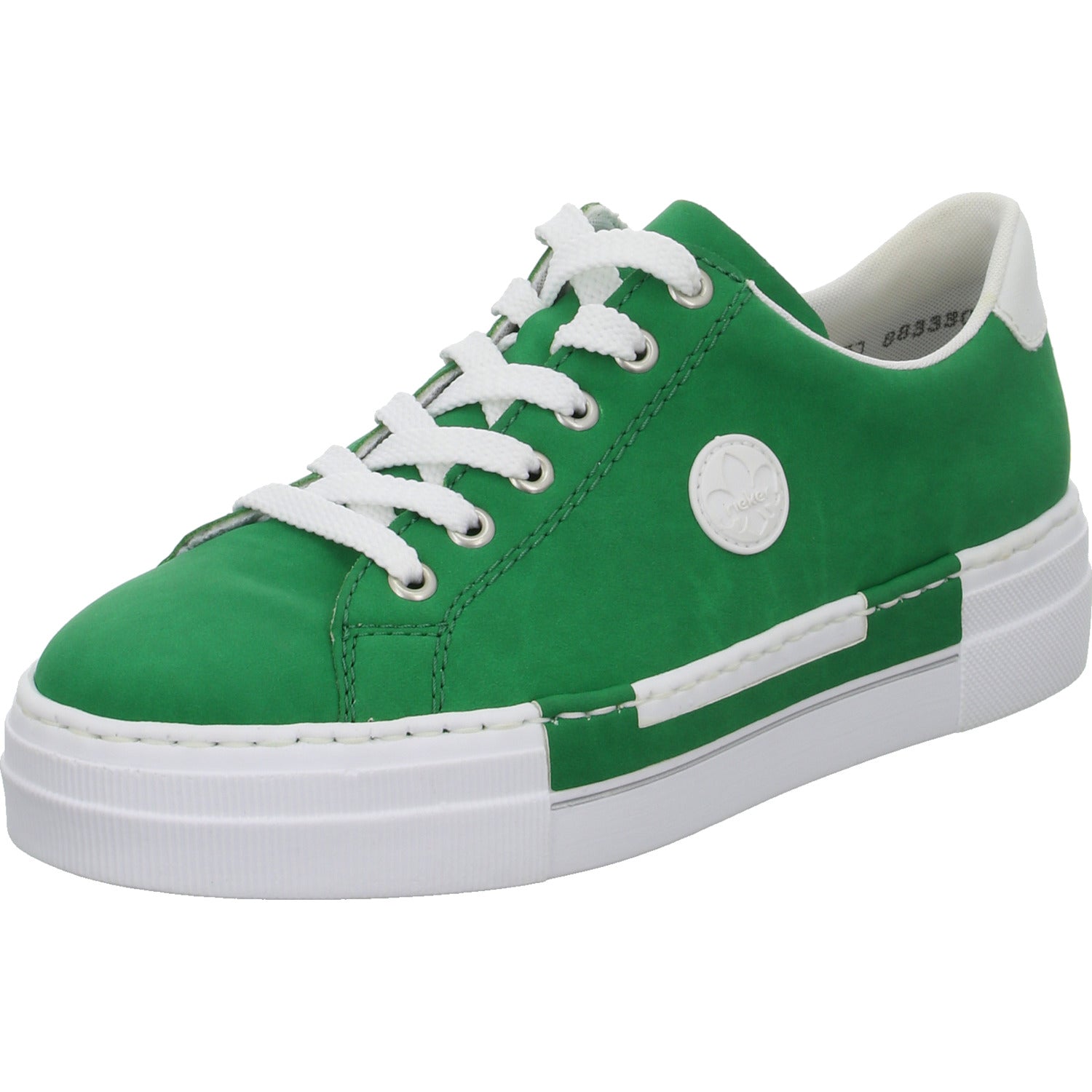 Das Obermaterial besteht aus weichem im Grundton grünem glattem Kunstleder.