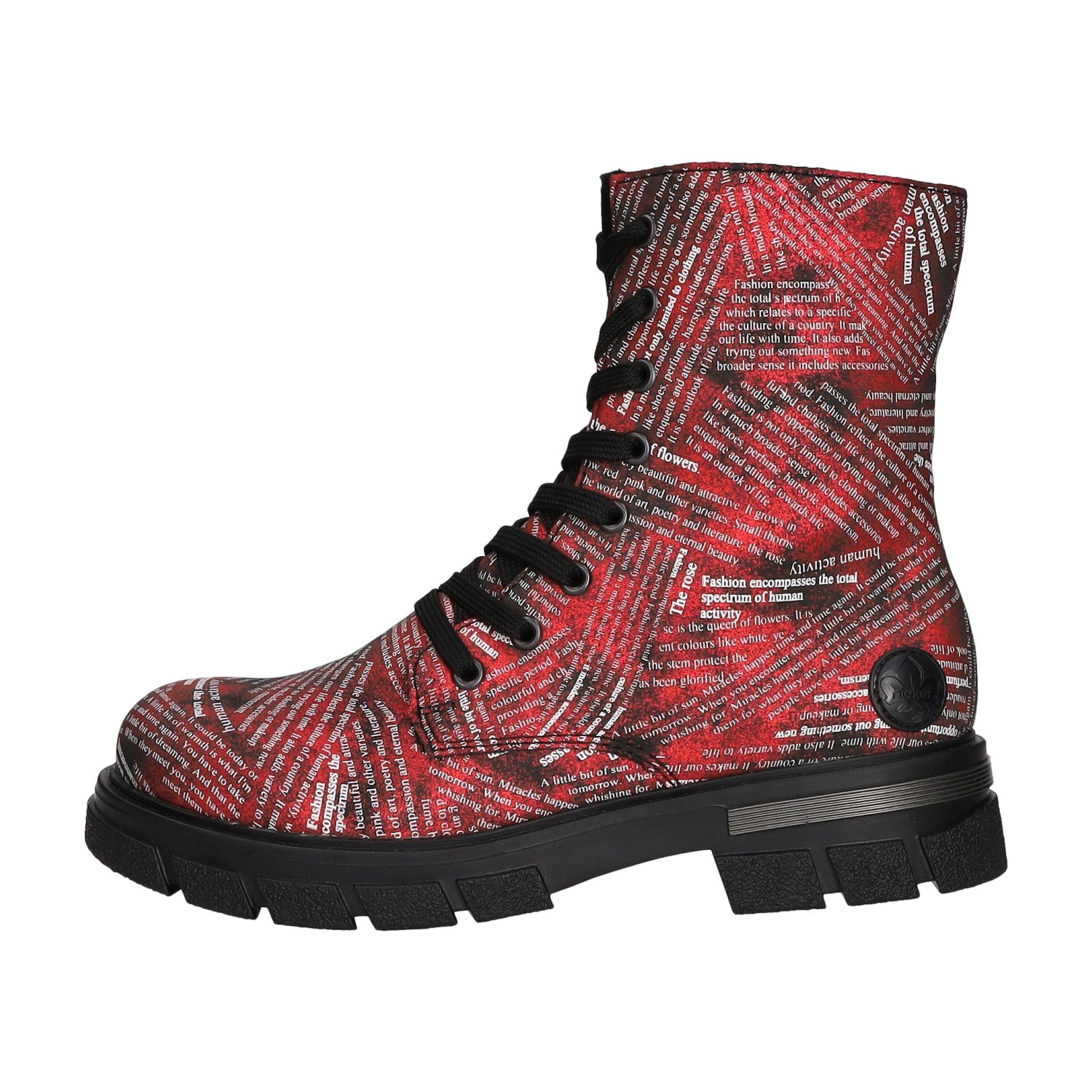 Der Hingucker sind die Schriftzüge auf der Stiefelette. Rieker Antistress-Eigenschaften: Schuhe sind leichter, flexibler, bieten mehr Platz und Schockabsorptionsfunktion.