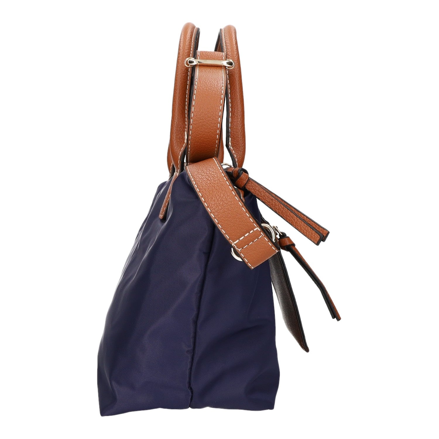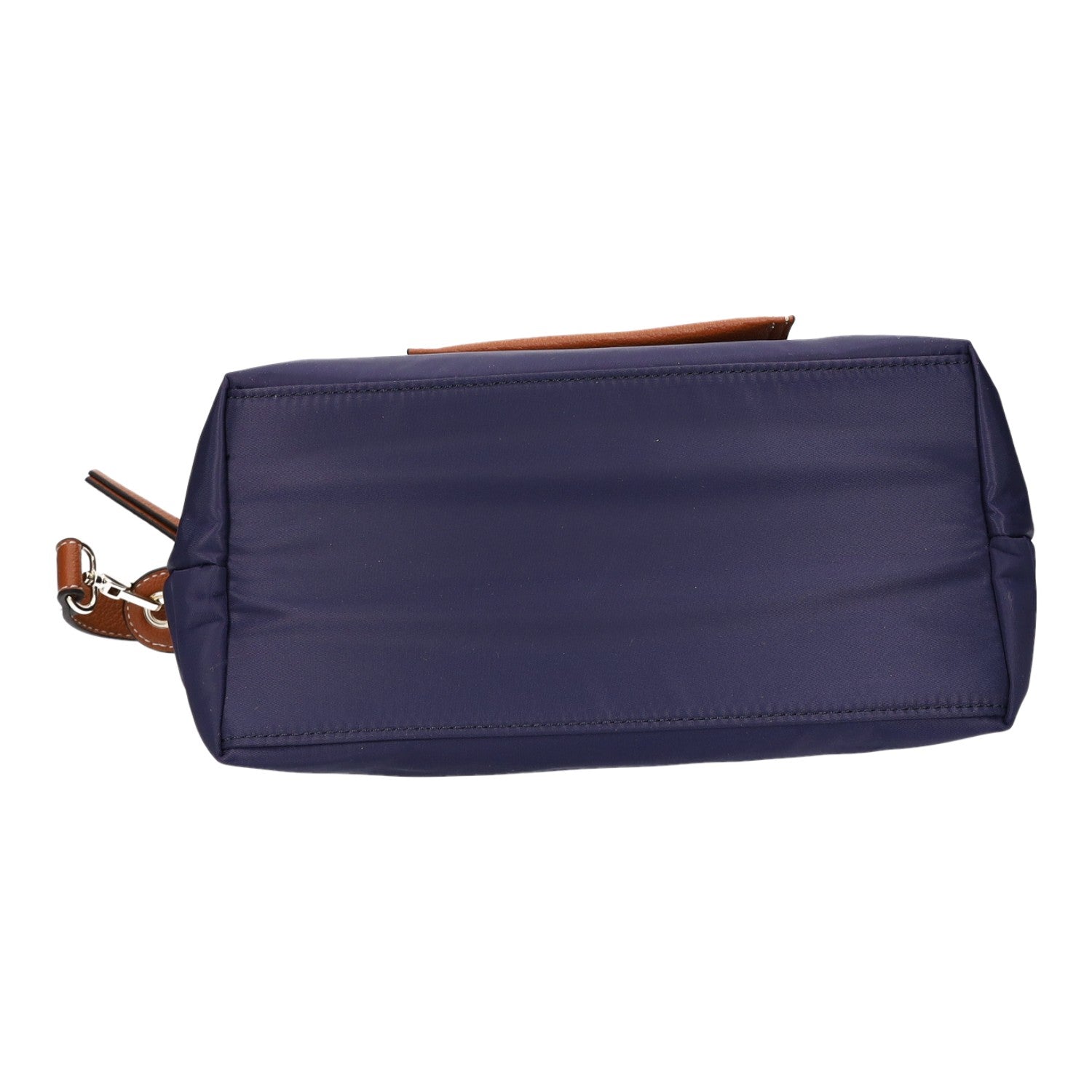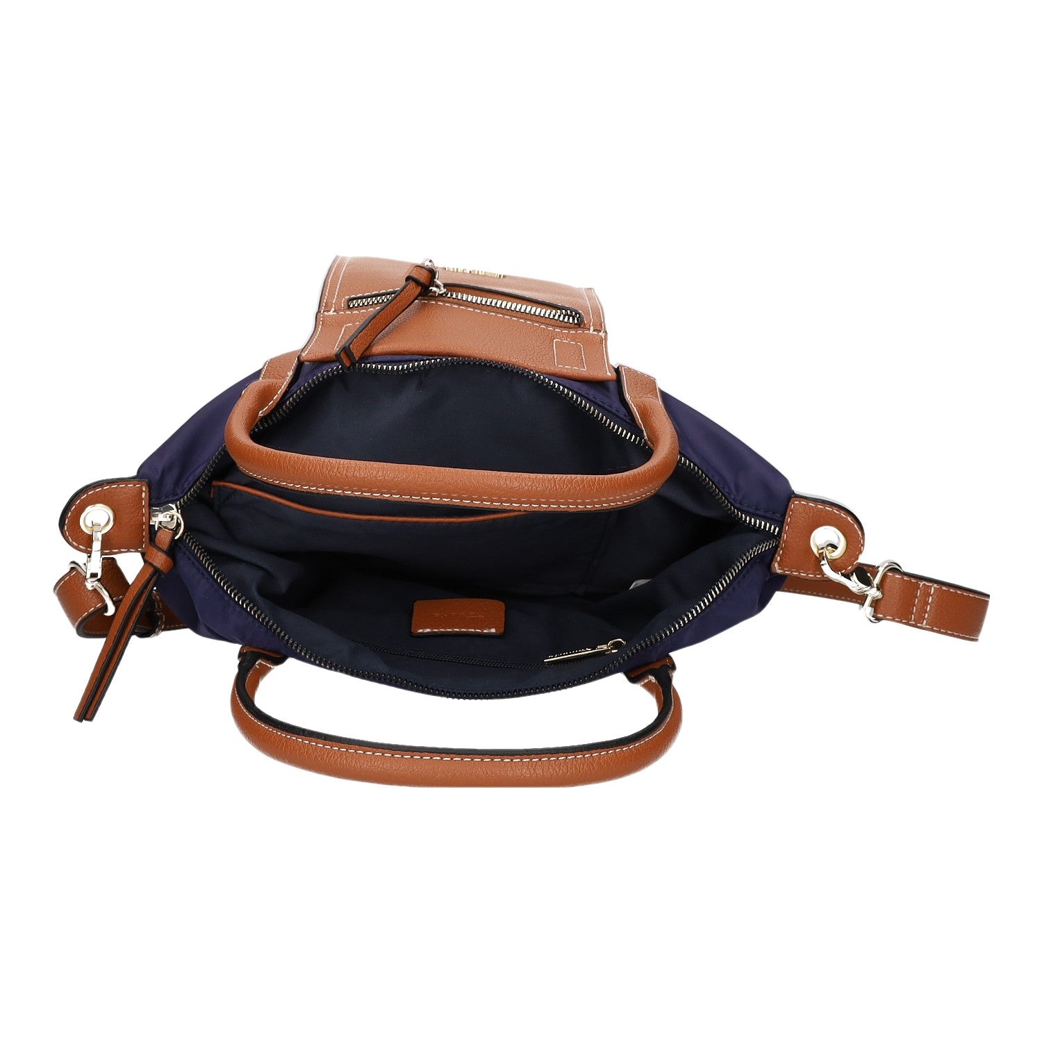 - Obermaterial aus dunkelblauem Nylon und braunem Kunstleder