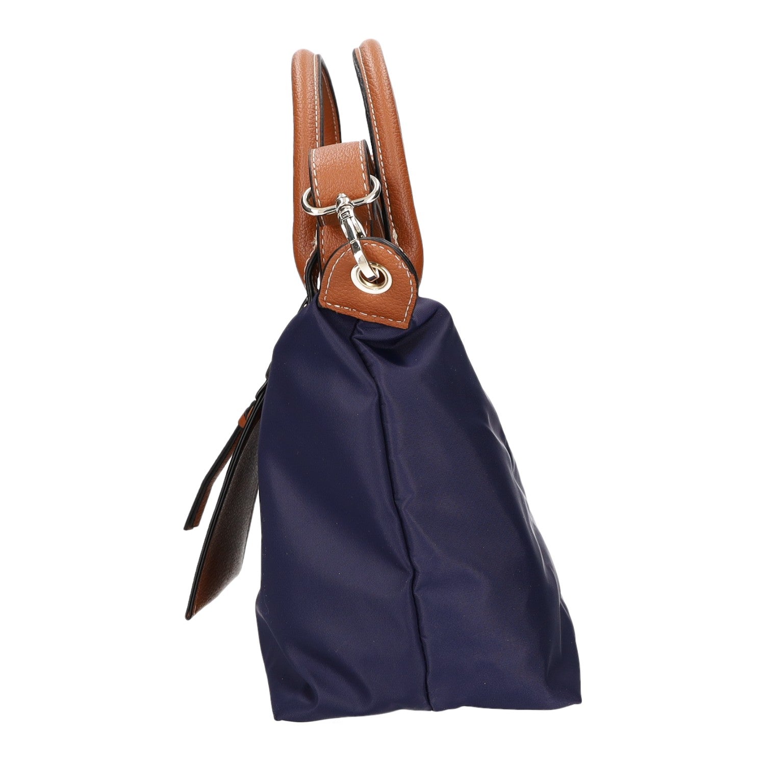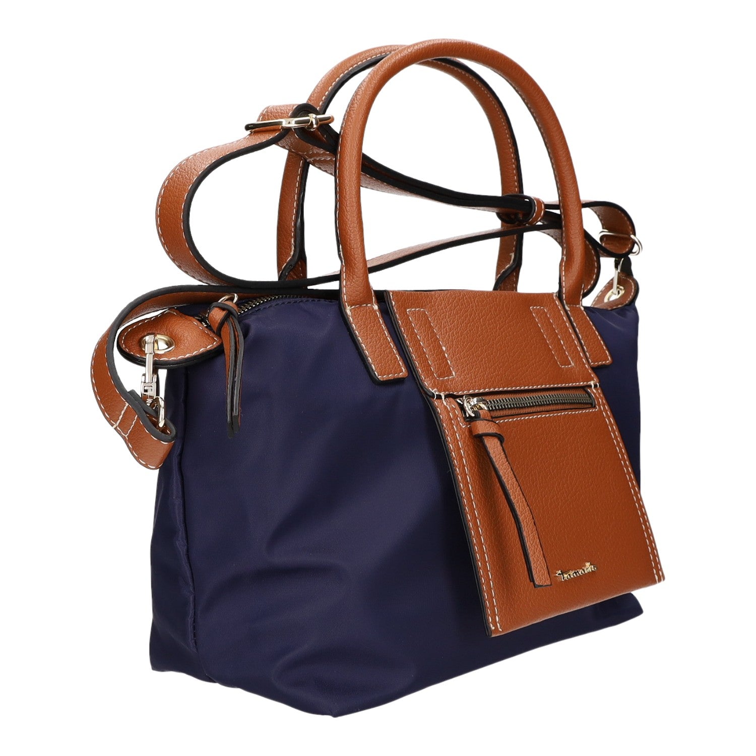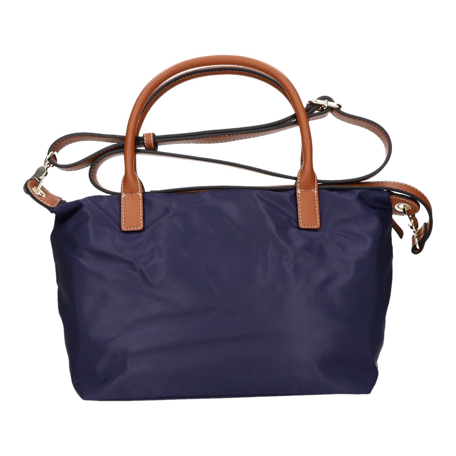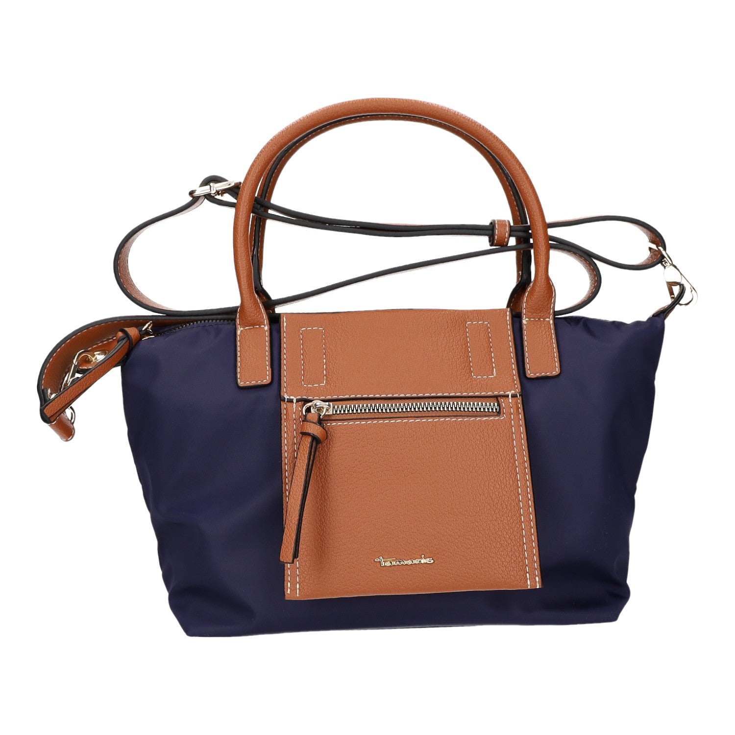 - Obermaterial aus dunkelblauem Nylon und braunem Kunstleder