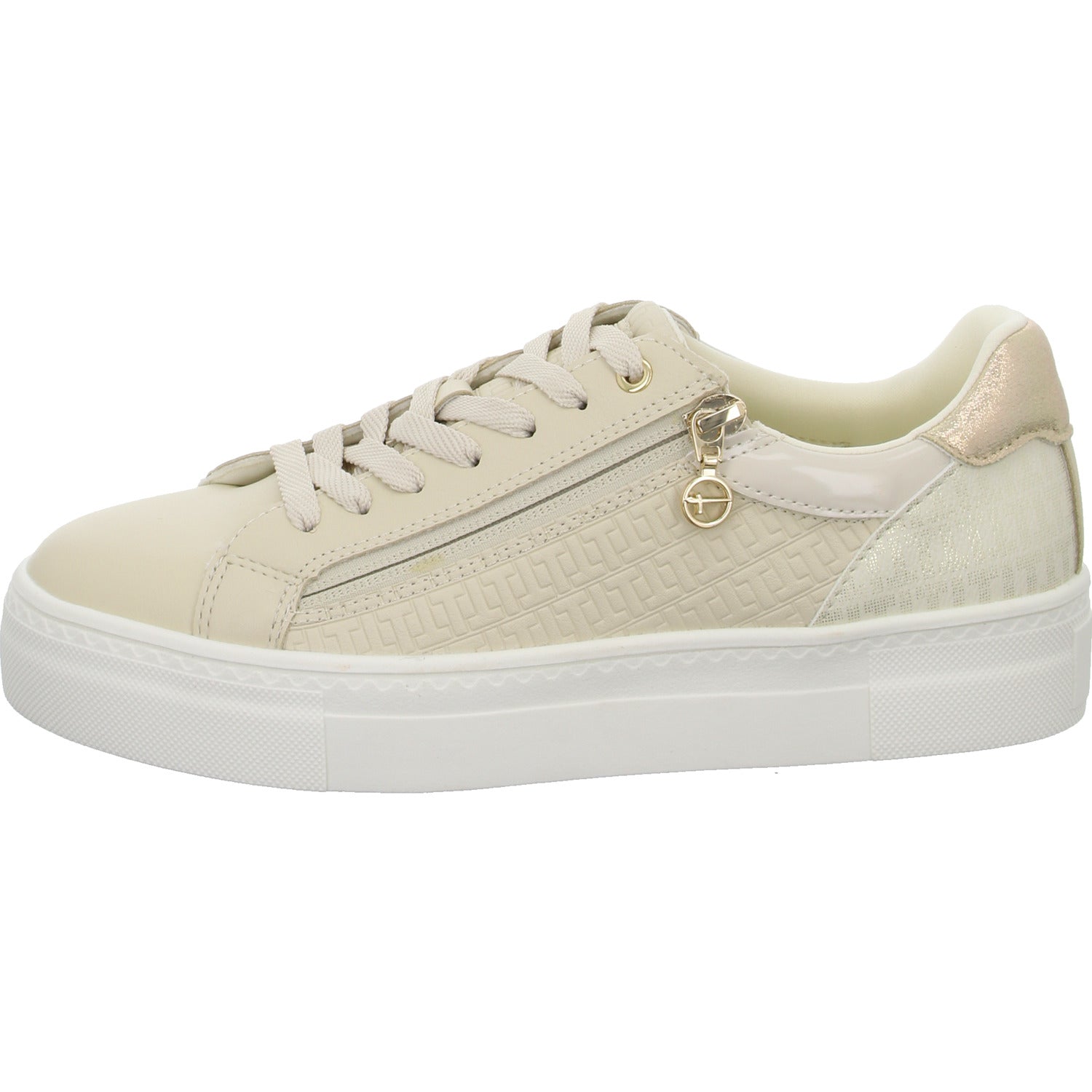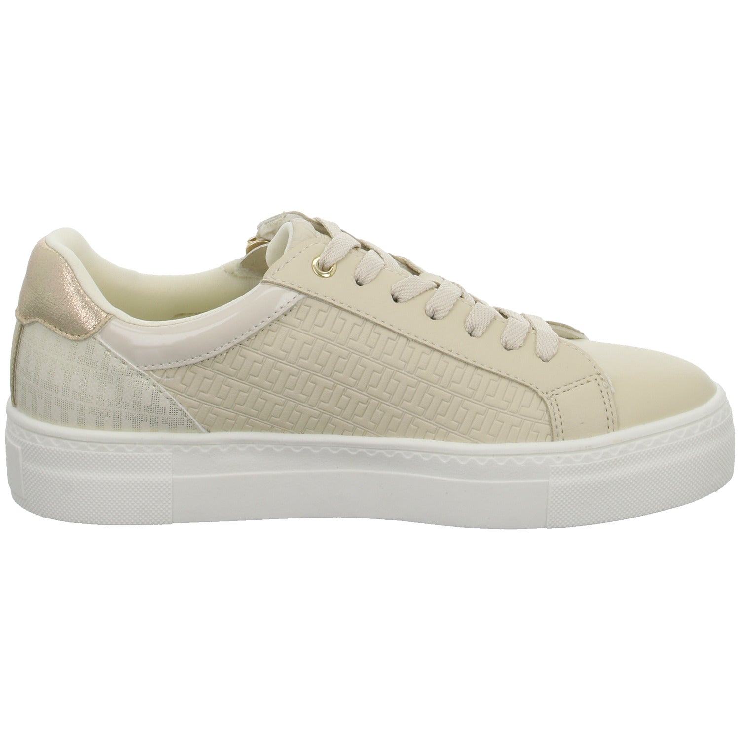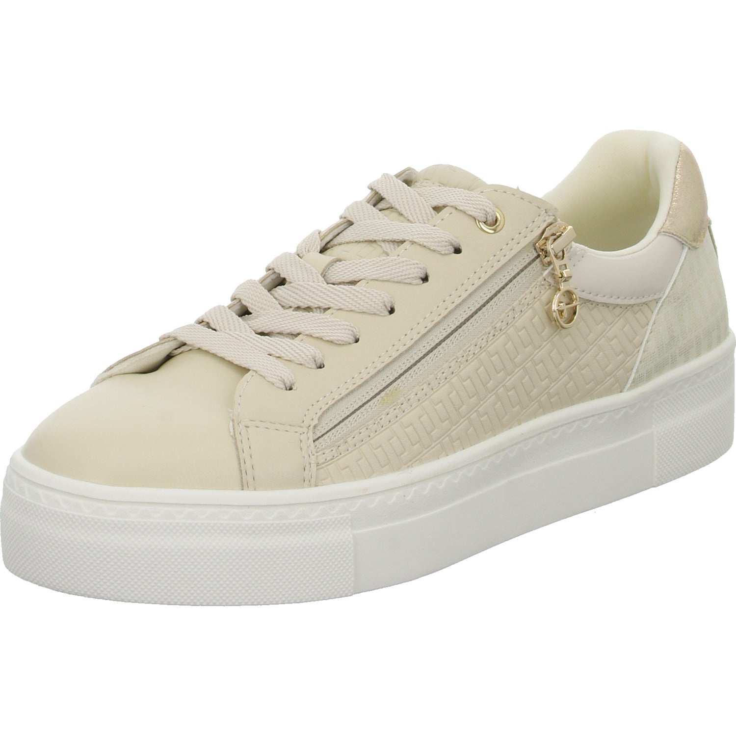 Das Obermaterial besteht aus hochwertigem im Grundton beigem glattem Kunstleder.