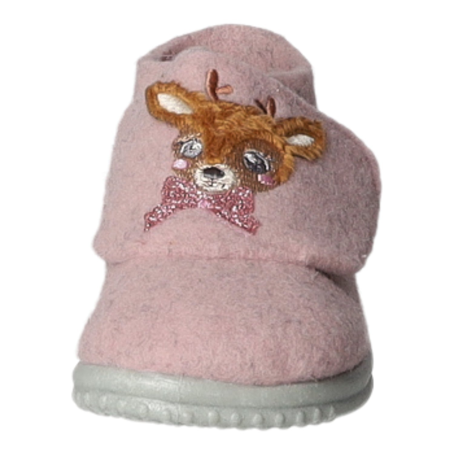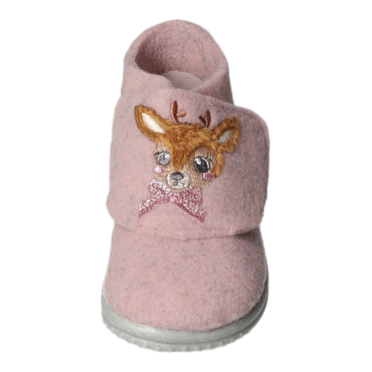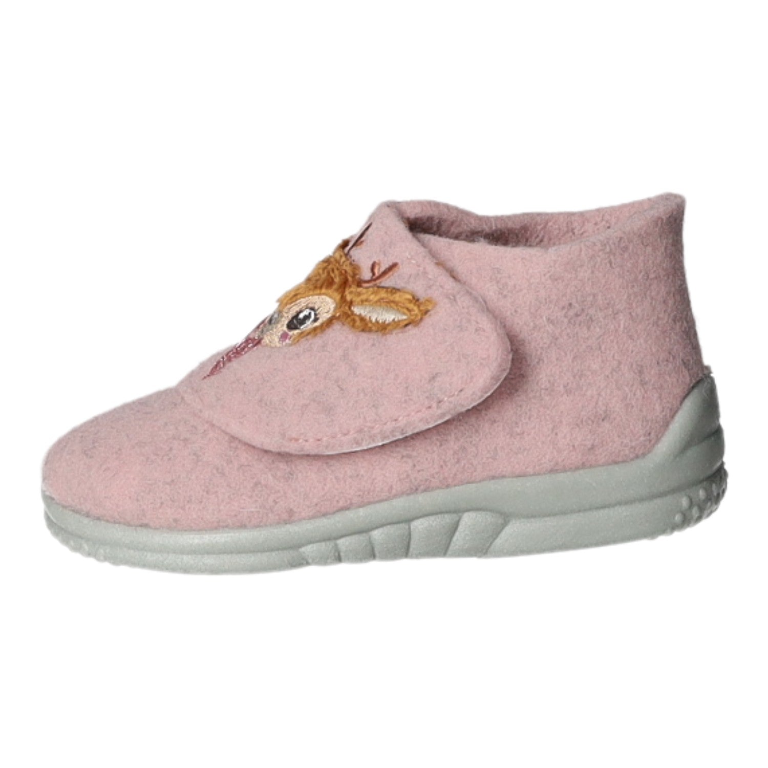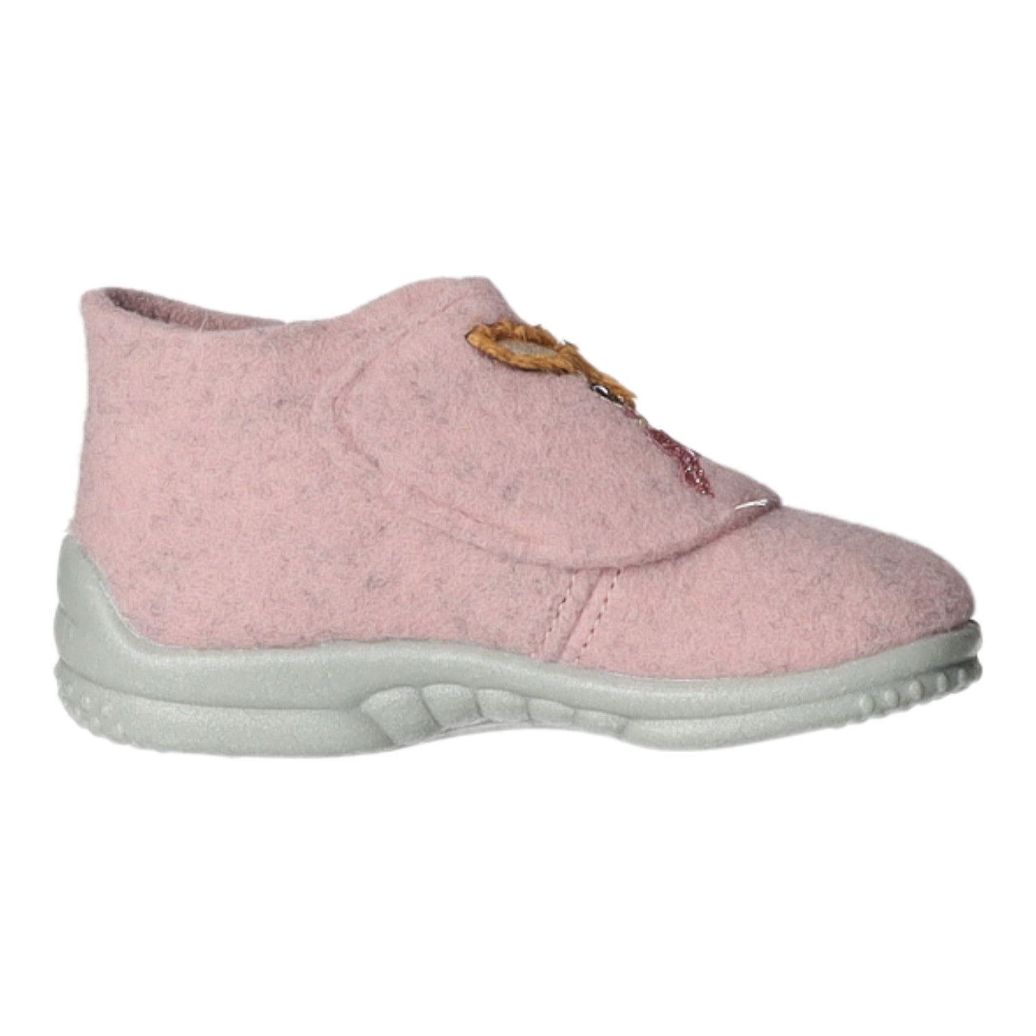 Das Obermaterial, das Innenfutter und die Decksohle bestehen aus rosa Filz.